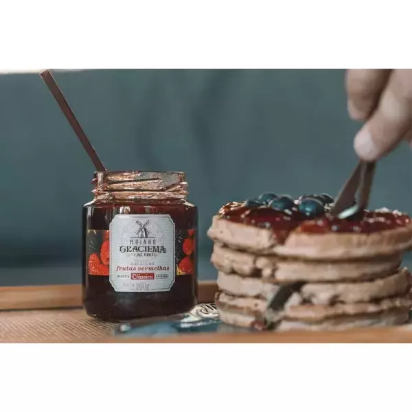 Delicada, aromática e cheia de sabor! A Geleia de Frutas Vermelhas do Moinho Graciema é feita artesanalmente com morangos, amoras e framboesas selecionados, resultando em uma combinação perfeita entre o doce e o ácido natural das frutas. Sem conservantes e com ingredientes naturais, ela é ideal para acompanhar pães, torradas, queijos, iogurtes ou até mesmo rechear sobremesas e bolos.